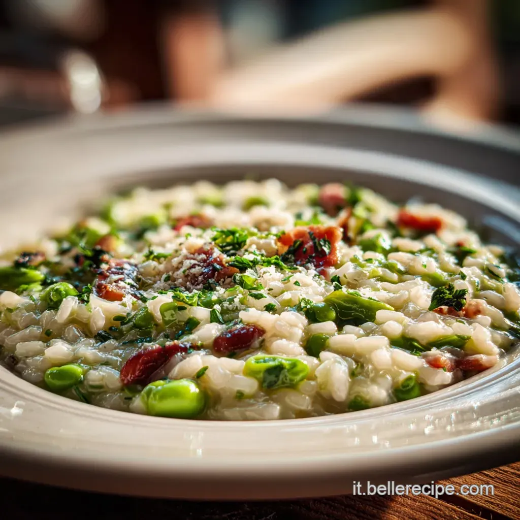 Per esaltare questo piatto, servilo in piatti piani e larghi, battendo leggermente il fondo con il palmo della mano per stendere il riso in modo uniforme. Guarnisci con le listarelle di guanciale croccante tenute da parte, qualche fava intera brillante e una spolverata di pepe nero macinato al momento. Un'idea originale è aggiungere qualche goccia di riduzione di aceto balsamico per una nota acida che pulisce il palato, come suggerito nella nostra Risotto Cremoso ai ricetta.